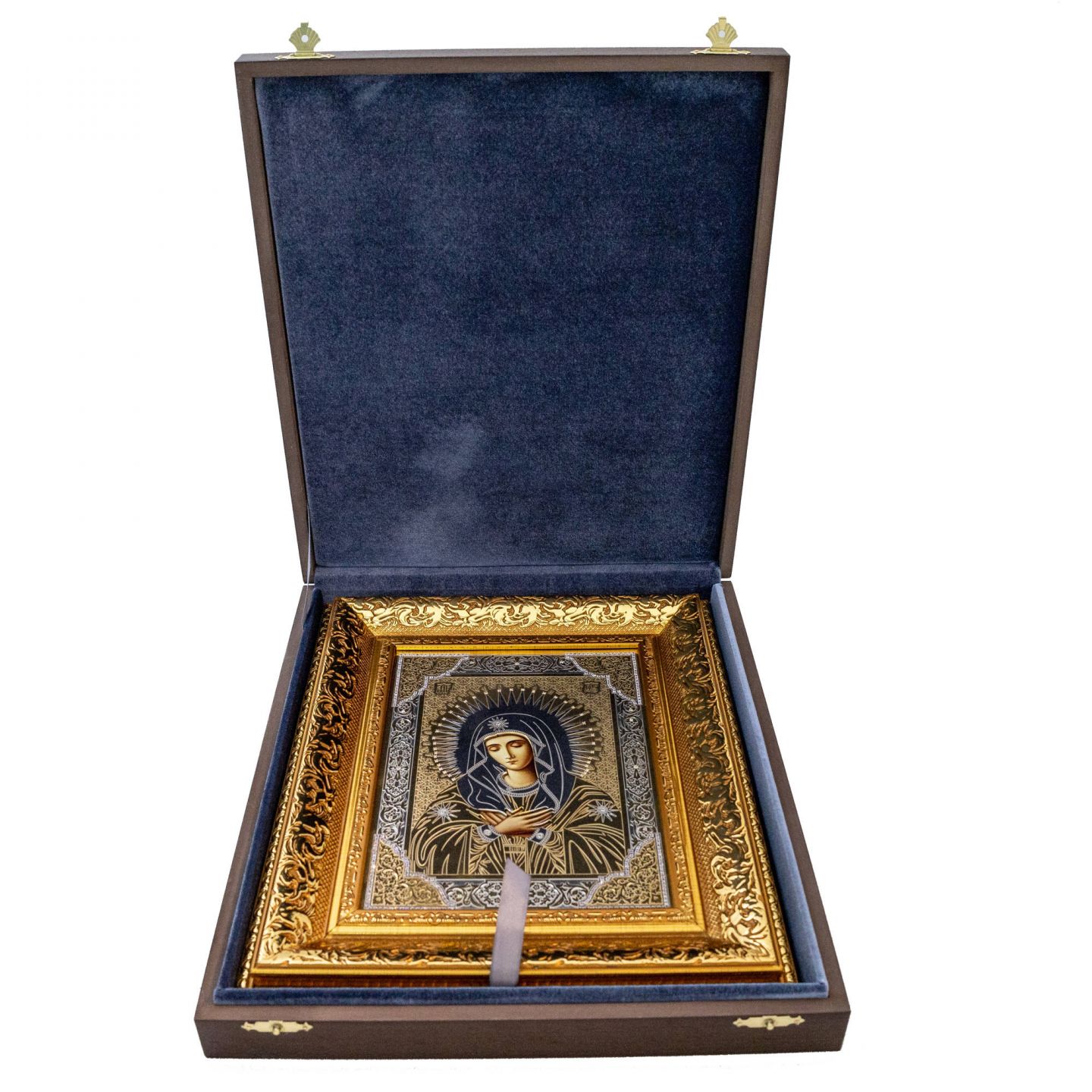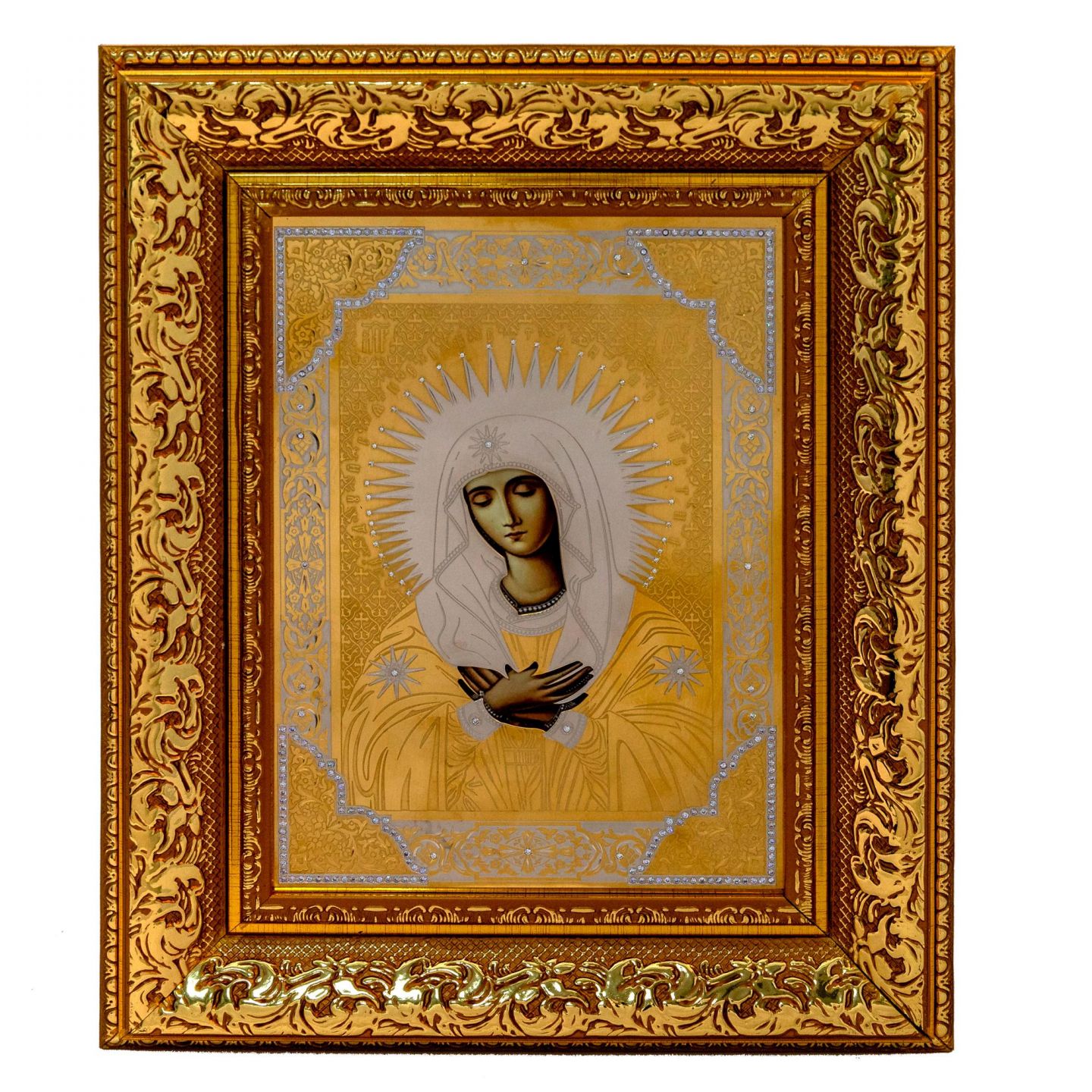 Над изображением закреплена латунная накладка с двойным гальваническим покрытием: никель создаёт гладкую основу, а финишный слой золота придаёт изделию тёплое благородное сияние. Металл украшен орнаментом и инкрустирован фианитами, которые добавляют акцентное мерцание, не мешающее молитвенному сосредоточению. Икона зафиксирована в прочный багет, исключающий деформацию.