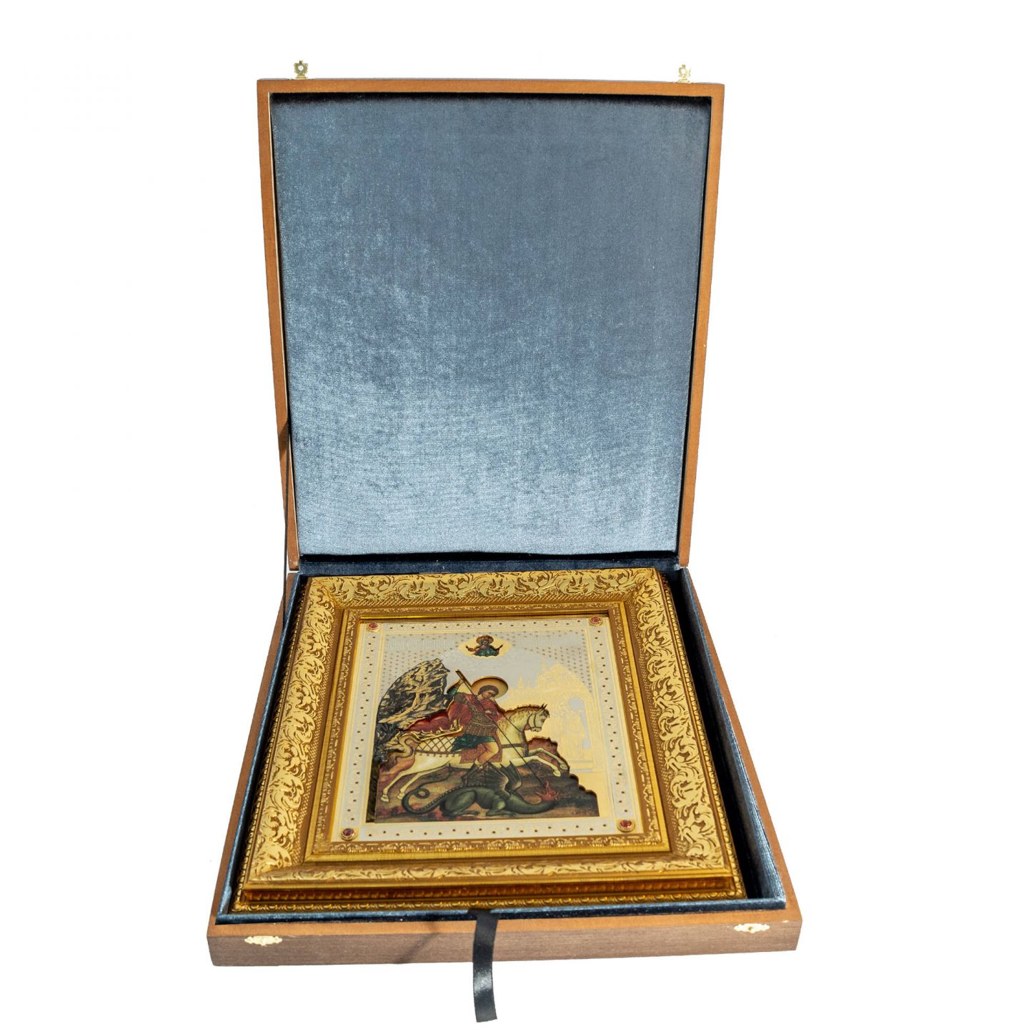 Икона святого Георгия Победоносца большого формата изготовлена по технологии UV-DTF печати, гарантирующей стойкость и яркость изображения. Лицевая часть защищена латунной накладкой с никелевым и золотым покрытием, расписана золотыми узорами и инкрустирована фианитами и кабошонами. Образ обрамлен качественным багетом.