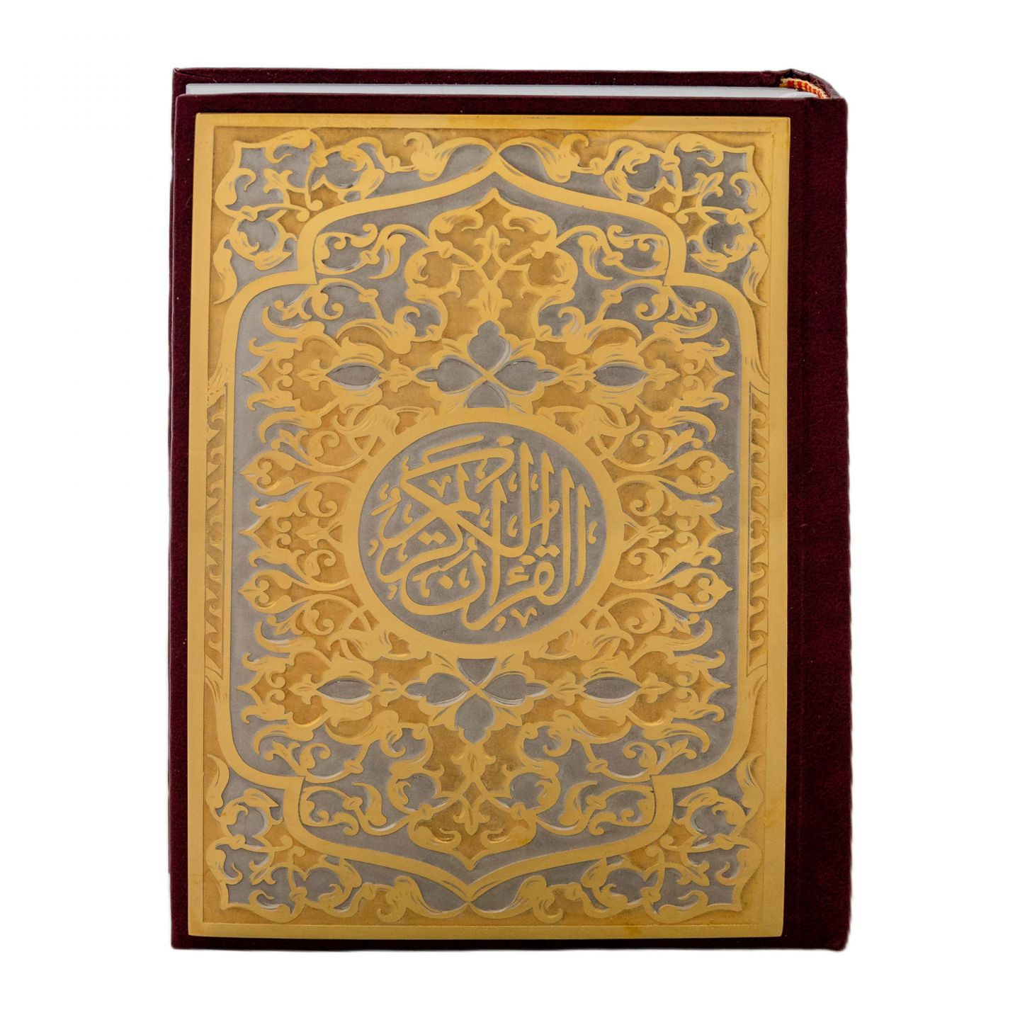 - Коран с металлическими накладками на обложке, украшенными золотым узором с обеих сторон (Размеры Корана: 125×172×35 мм.);