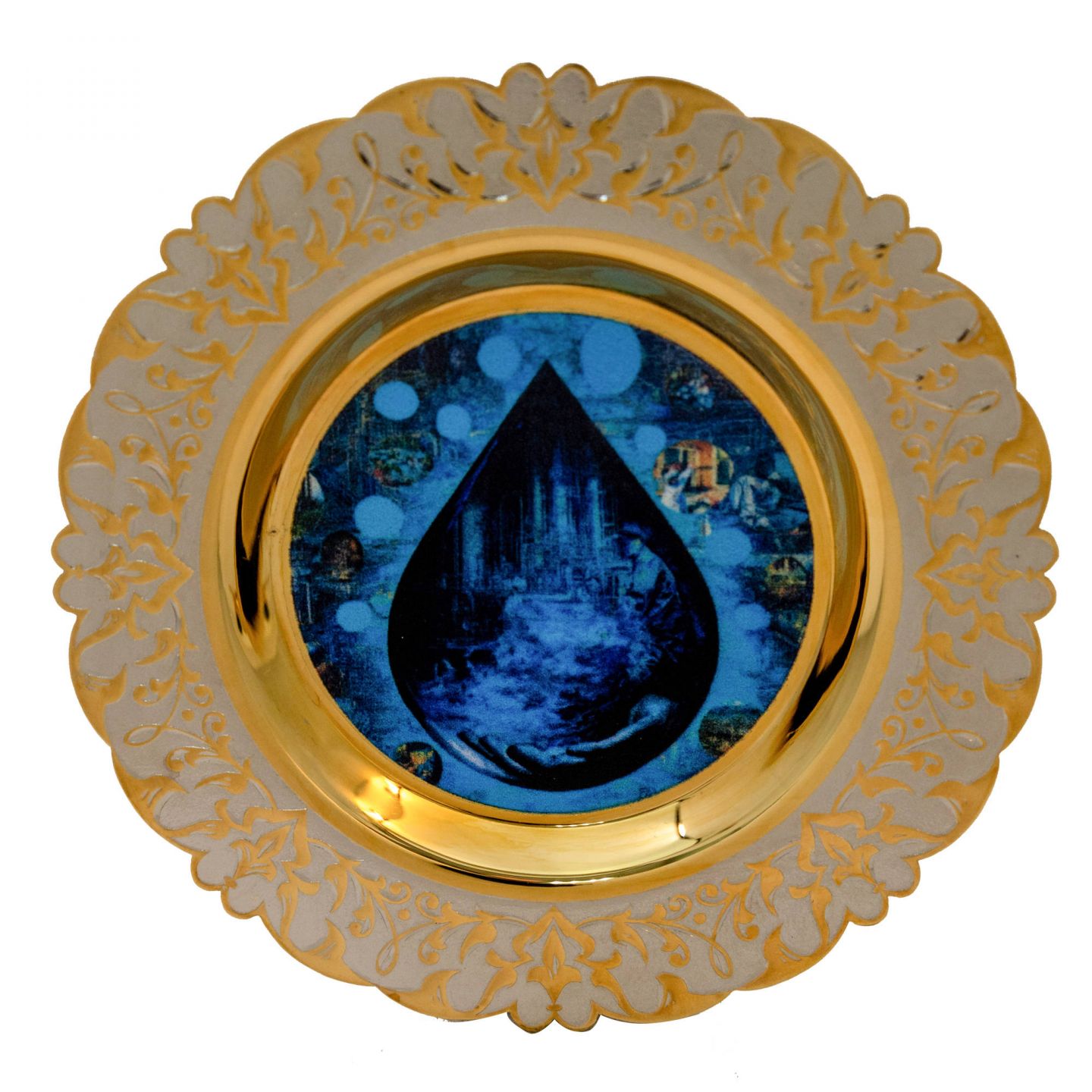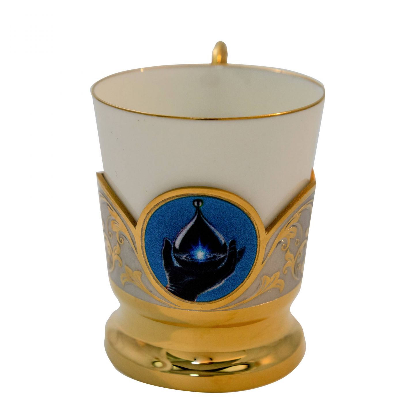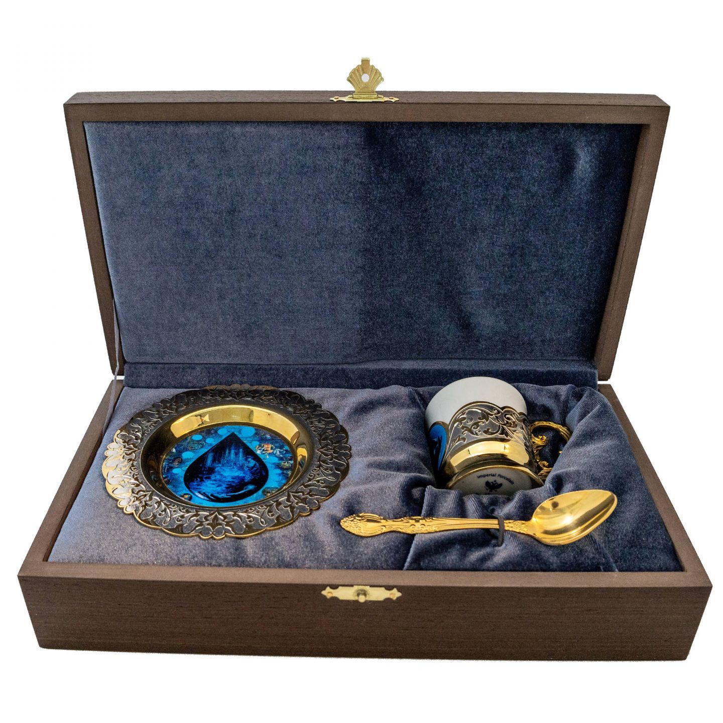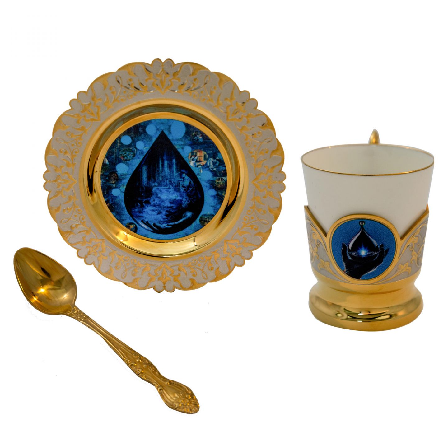 Элитный кофейный набор ручной работы создан для истинных ценителей прекрасного. В комплект входит блюдце диаметром 120 мм, чашка высотой 65 мм и ложка. Все предметы изготовлены из высококачественной латуни и императорского фарфора. Покрытие выполнено гальваническим способом: никелирование и золочение 999,9 пробы толщиной 5 мкм. На блюдце и чашку методом UV-DTF печати нанесено изображение капли нефти. Уникальный внешний вид изделия достигается благодаря сложной многоступенчатой технике исполнения: токарные и слесарные работы, многоступенчатая гравировка иглой по лаку, травление, ручная подрезка и полировка.