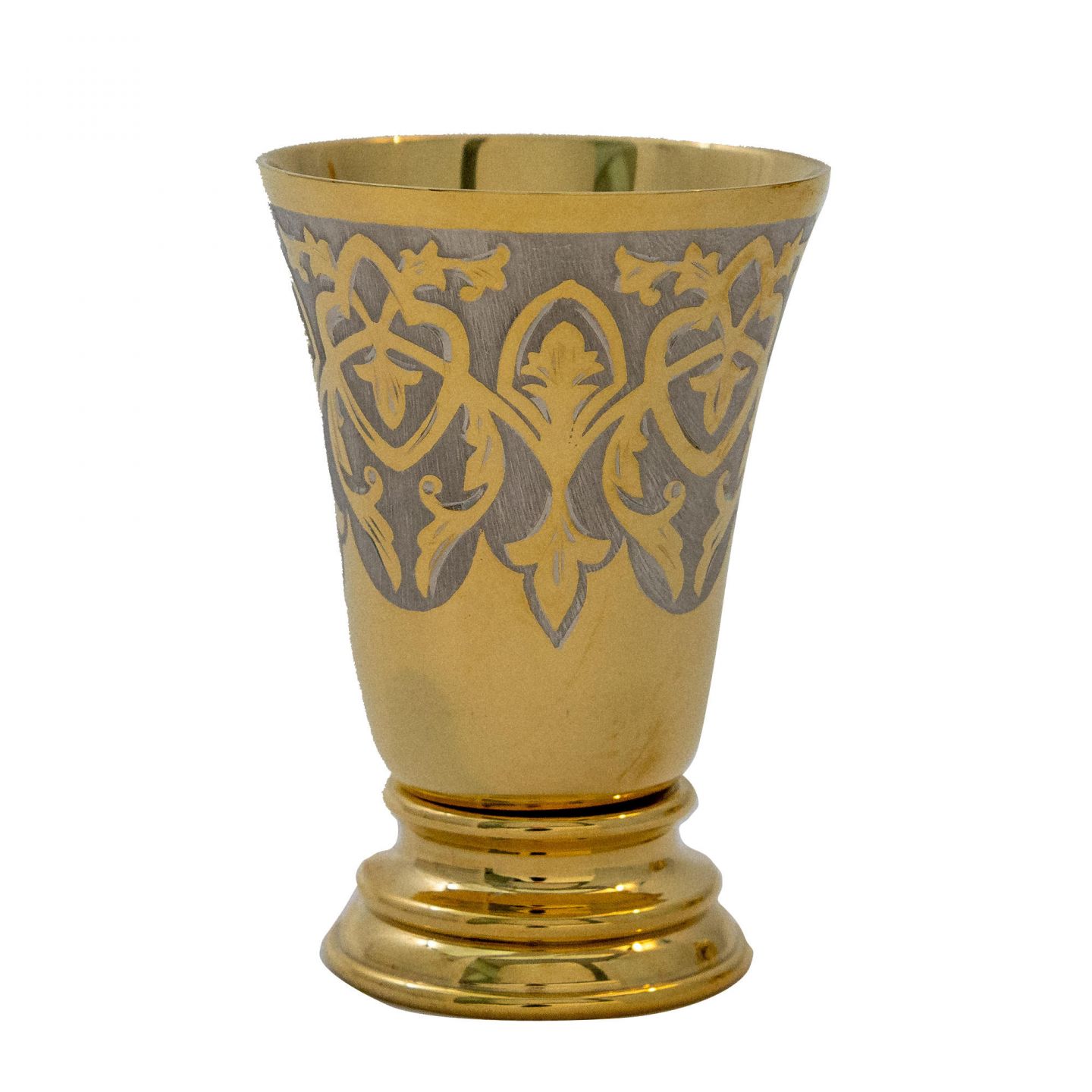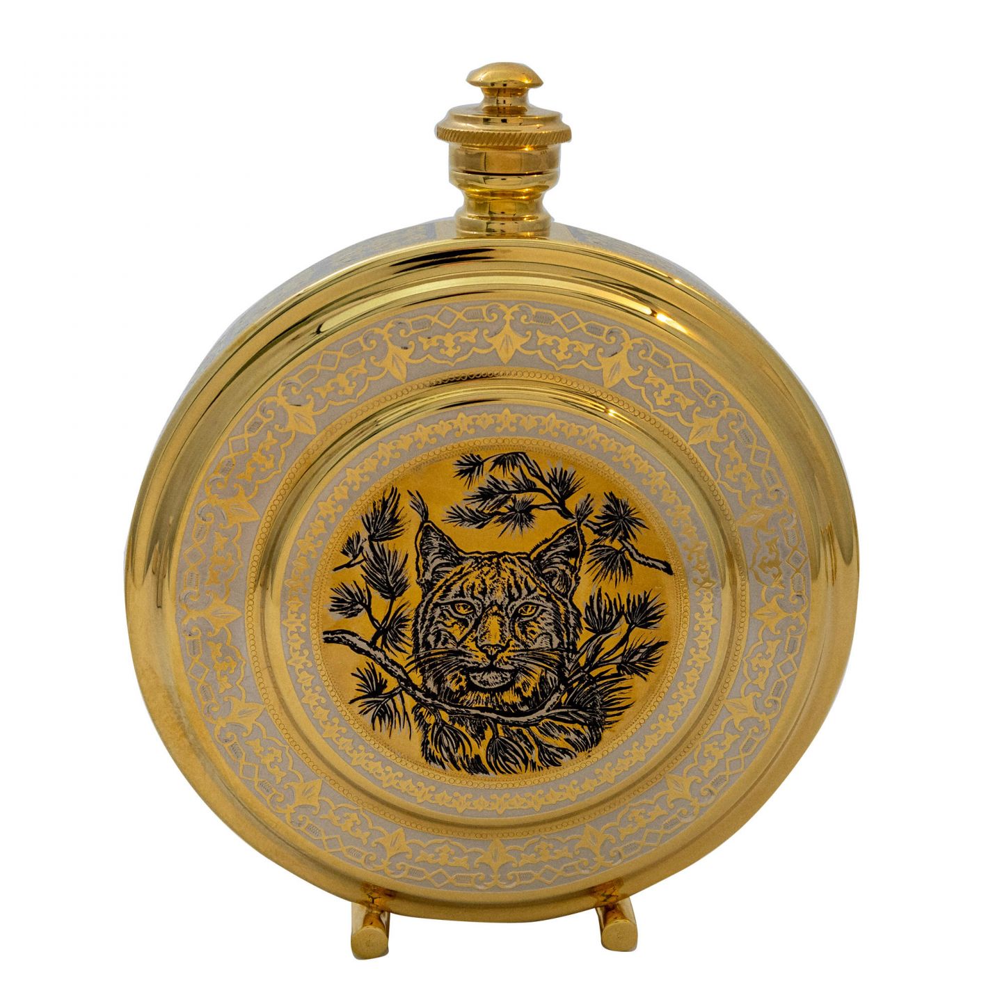 Элитный охотничий набор, состоящий из круглой фляжки и трех рюмок. Изделия изготовлены из латуни с покрытием никелем и золотом, что обеспечивает прочность и роскошный внешний вид. На фляжке нанесено изображение рыси в стиле златоустовской гравюры на стали, на рюмках — изысканный орнамент.