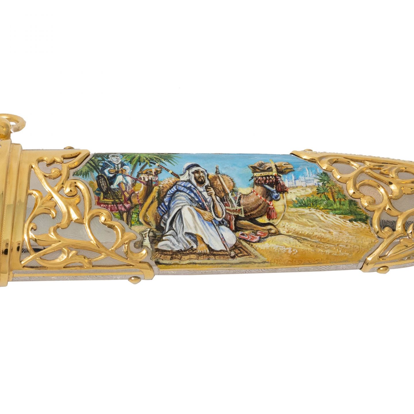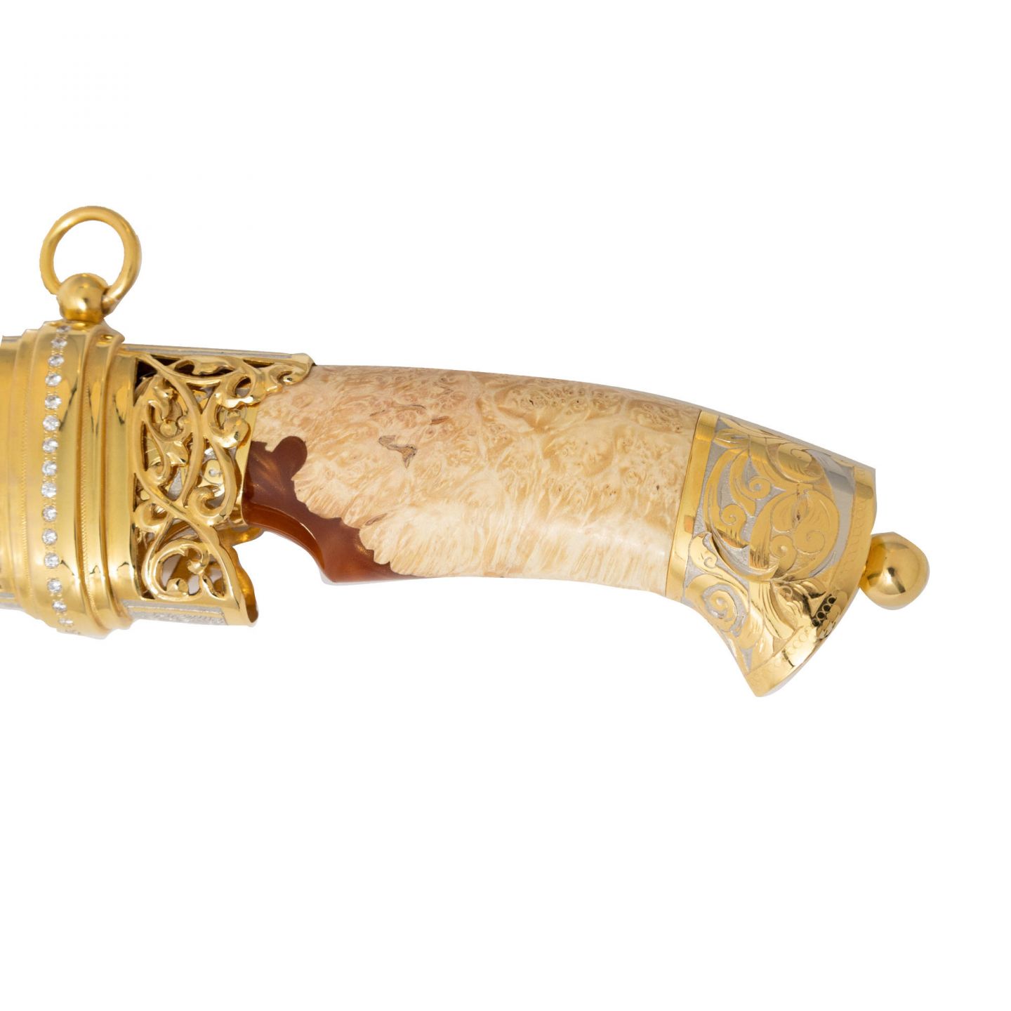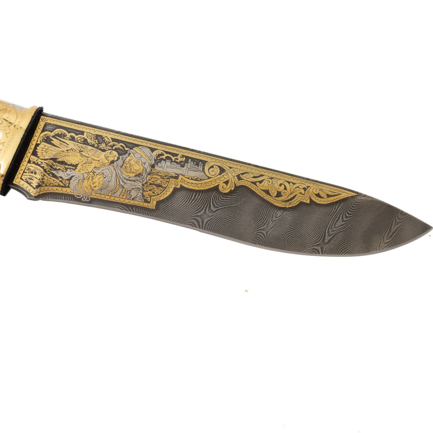 На клинок методом златоустовской гравюры нанесён позолоченный рисунок. Рукоять изготовлена из смолы, обеспечивающей удобный хват и комфорт. Небольшой упор повышает безопасность обращения с ножом. Цельнометаллические ножны покрыты никелем и золотом, на них нанесён рисунок акрилом.